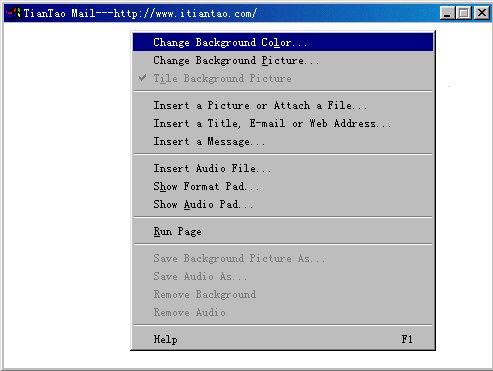 当建立了一个新邮件后,你会看到一个白色背景的窗口弹出。在窗口点击鼠标右键,从弹出的快捷菜单(如图2)中选取Change Background Color,从颜色板选取你喜欢的颜色来改变窗口背景颜色。选取Change Background Picture可以利用图片作为背景,Talk-n-Mail提供了八张卡通图片;