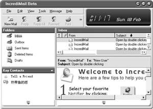 IncrediMail的下载、安装都比较简单,我们就不多说了,一起来看看IncrediMail的使用方法。启动IncrediMail,它会弹出一个注册窗口,这里你只需填上一些简单的信息,然后连上网络,按Next就会自动完成注册,注册完成后,就可以看到IncrediMail的主界面了(如图1)。