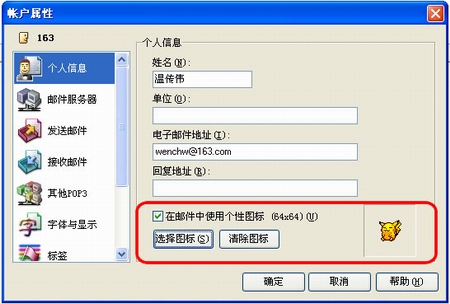 选中某一个帐户,单击工具栏中的“属性”按钮,打开“帐户属性”对话框,进入“个人信息”栏,如图1所示,选中“在邮件中使用个性图标”复选项,通过“选择图标”按钮,您可以选择Foxmail4.2提供的小动画作为个性签名,也可以选择其他喜欢的.gif格式的小图片或者动画,图片的大小要在64×64像素以内。
