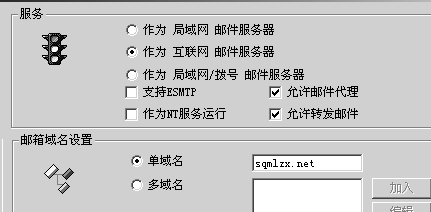 安装好软件后运行CMailServer,单击“工具→服务器设置”,选中“作为互联网邮件服务器”,在邮箱域名设置中,选择“单域名”,填入上一步已设好邮件交换记录的域名“sqmlzx.net”,如图4。