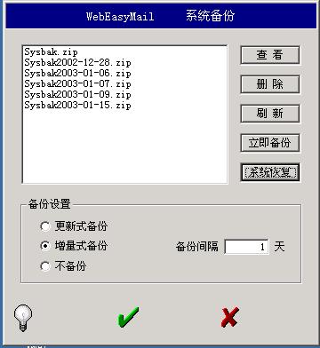 在‘系统备份’中,如图10,可以查看以前备份的详细内容,也可以删除以前的备份;备份时可选取‘立即备份’或‘更新式备份’备份以前所有内容,也可设置以一天为基准的‘增量式备份’或‘不备份’。
