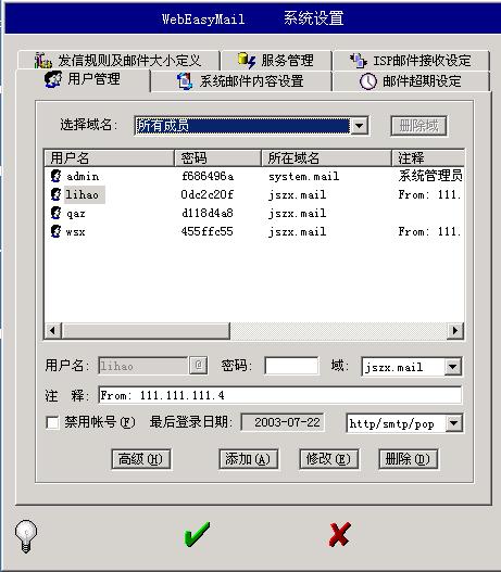 我们可以设置如‘lihao’的用户即日起帐户禁用或进行对此用户的修改、删除;点如图12中的空白处增加帐户;在‘高级’中我们可以设置POP3代理的接收服务器、端口号、用户名、密码以及该用户的多下载POP3代理;也可设置该用户的邮件拒收、自动回复、自动转发功能以及其邮箱大小为200M。