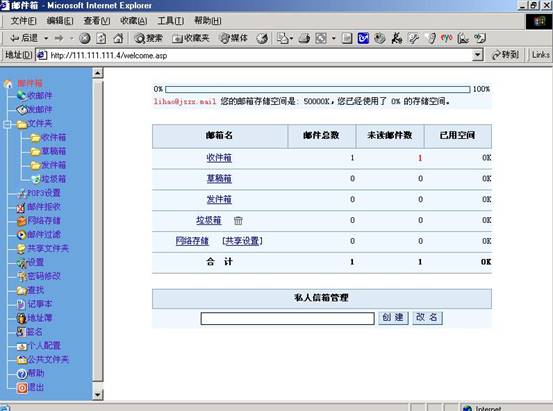 如图19,登陆后我们可以看到如新浪、雅虎、21世纪、网易、263等知名网站相似的邮箱界面,内容也并不比它们少,用起来也不比它们差。