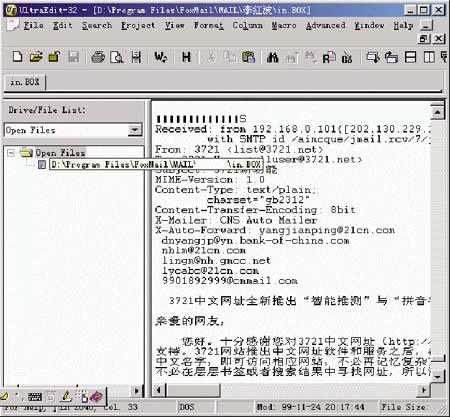 启动UltraEdit32,然后打开Program Files\FoxMail\mail\文件夹下的有关box文件(in.box为收件箱文件、out.box为发件箱文件、sent.box为已发送信件信箱文件、trash.box为废件箱文件,而Aaaaa1.box、Aaaaa2.box等则为自定义邮箱文件,广大用户应根据误删邮件所在邮箱进行选择)。