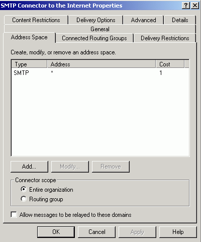 除了在Default SMTP Virtual Server上要防止Open-Relay之外,我们还需要注意SMTP Connector上的设置。虽然Exchange 2000无需SMTP Connector就已经能够通过SMTP Virtual Server来收发Internet的邮件,但许多公司还是会创建一个或多个SMTP Connector来更好地细化和定义对外发信的路由。通常会有一个SMTP Connector的地址空间(Address Space)是*,表示发向Internet上所有外部域的邮件都可以通过这个SMTP Connector出去。在Exchange System Manager中打开这个SMTP Connector属性对话框,为了不使服务器处于Open-Relay状态,在Address Space选项卡上(如图2)确保底部的"Allow messages to be relayed to these domains"选项没有被选中。