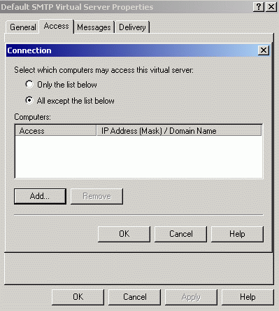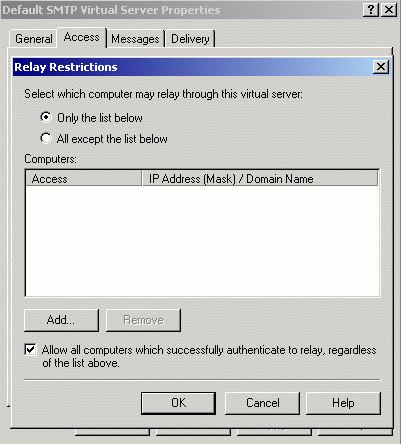(5).最下面的"Allow all computers which successfully authenticate to relay, regardless of the list above"为可选项。如果你有用户要通过POP3或IMAP4的方式来访问服务器上的邮箱,那么这个选项一定要选中。选中这个选项后,Exchange服务器并没有处于Open-Relay状态,这个选项只是用于让那些能够提供正确用户名和密码的POP3或IMAP4合法用户来转发邮件,Internet上其他未经认证的服务器仍然不能转发。若是我们没有POP3或IMAP4用户,这个选项可以不选中。