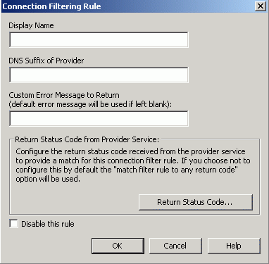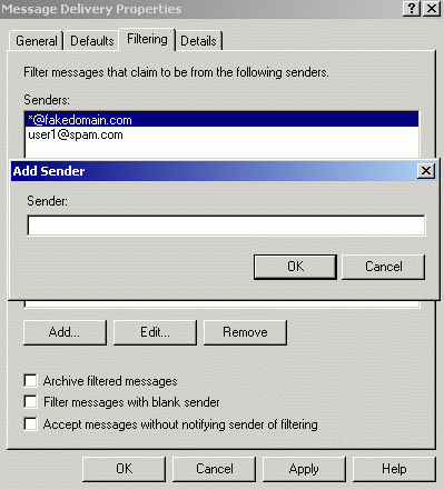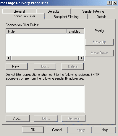 其中Sender Filtering选项卡上就是Exchange 2000中的过滤器,新增了"Drop connection if address matches filter"这一选项;Recipient Filtering选项卡上为收信人过滤器功能,可以指定拒收收信人为任意特定地址的邮件,或是选中"Filter recipient who are not in the Directory"来只接收那些发给其目录(即Windows的活动目录)中收件人的邮件。这样Exchange服务器就不用象以前那样对于发送不了的垃圾邮件进行退信(NDR),节省了资源。通常情况下,垃圾邮件散播者用的地址都为空地址或是假地址,以前当NDR信件本身也不能被发送出去时,会堆积在Exchange服务器上的BadMail目录中,需要管理员定时清空这些邮件。但需要注意的是,由于SMTP协议会对非法的收件人地址返回相应的5.x.x代码,所以使用收信人过滤器可能会让一些恶意的垃圾邮件散播者识别出哪些邮件地址是存在的,哪些是不存在的。这一点大家需要注意。