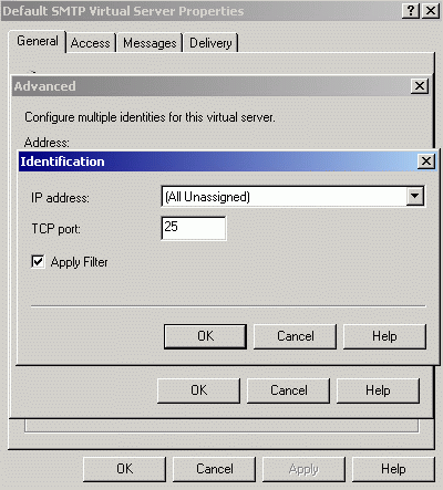 (5).打开Default SMTP Virtual Server的属性对话框,在General选项卡上点击Advanced按钮,然后再点击Edit按钮。