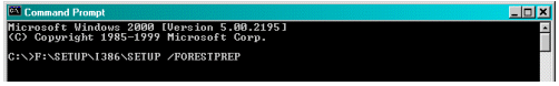 在命令提示字元中鍵入 C:\>F:\ SETUP\I386\SETUP /FORESTPREP