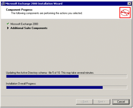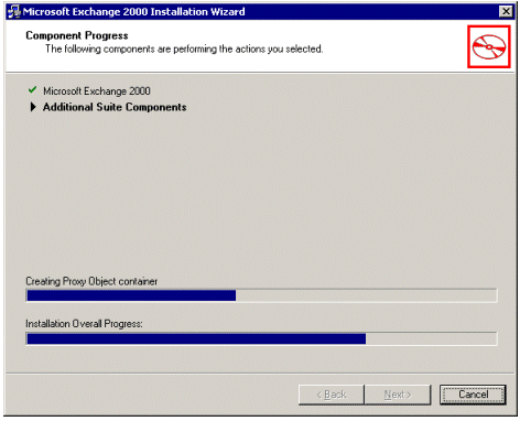 於 [元件進度] 畫面中,您可以看到元件安裝的進度。此程序將會建立主控 Exchange 管理者及伺服器的 Windows 2000 群組。