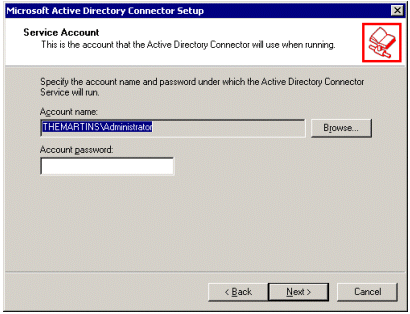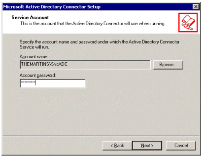 co服務帳號畫面中,輸入您希望用於 ADC 及其作業的帳號。預設的帳號為您登入的帳號,但這或許不是您希望使用的帳號。如果預設帳號可以接受,請按一下下一步,然後進入步驟 8。如果您已建立了用於此服務的帳號,請按一下瀏覽,然後進入步驟 7。