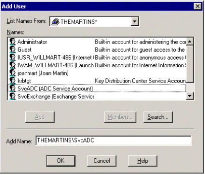當您按下瀏覽時,畫面上會出現下列對話框。選取您希望專用於新 ADC 服務帳號的帳號,然後按一下 [確定]。