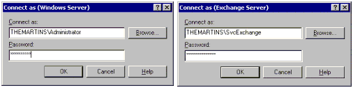 於 [連線] 標籤上,指定一個具備讀取及寫入權限的帳號,以修改 Exchange 目錄中的項目。您可以使用 Exchange 5.5 服務帳號或其他被賦予必要權限的帳號。