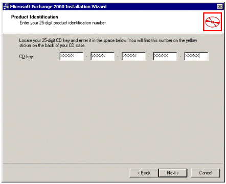 後續出現的精靈畫面與 ForestPrep 程序中的畫面完全相同。於第一個畫面,按一下 [下一步];於第二個畫面,按一下 [我同意],接著按一下 [下一步];於第三個畫面,鍵入 Exchange 2000 Server 光碟外殼背面可以找到的產品 ID 號碼,最後按一下 [下一步]。