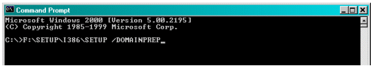 於命令提示字元中鍵入 C:\>F:\SETUP\I386\SETUP /DOMAINPREP (其中 F:為您的光碟磁碟機)。