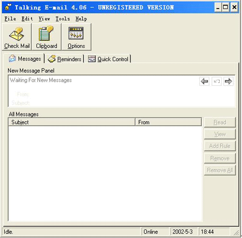 Talking E-mail是一款E-mail朗读工具,但它的读法和一般邮件朗读工具的不同之处在于,它的眼力特别好,能专门为你朗读远程邮箱中的邮件:当你在网上冲浪时,它的“千里眼”会时不时地向你的远程邮箱窥视一下,一旦发现有新邮件,朗朗的读信声就会在你耳边响起用。呵呵,用耳朵收听千里之外的邮件,是不是有点酷呢?