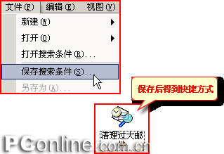 如果你要定期进行这样的查找工作,可以在查找结束之后,选择“文件->另存为”将查找设置保存为一个快捷方式,以后只要打开快捷方式就可以立刻进行Outlook 2002清理,而且不用启动Outlook 2002。图 11。