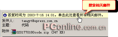另外查找相关邮件还有一个更加简便的方法,当打开一个已经被回复了的邮件时,在邮件查看窗口上方就会有一个黄色的信息条显示回复这个邮件的时间,同时提供了一个找到所有相关邮件的快捷方式,单击这个快捷方式就可以查找所有的相关邮件了。图 12。