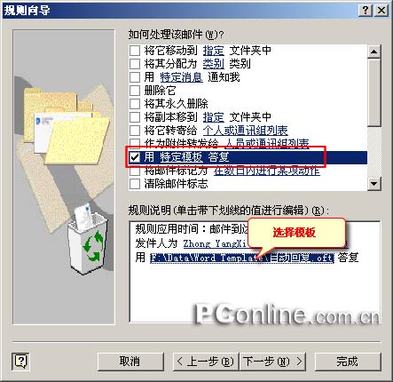进入下一步选择规则满足时的动作,选择使用“特定模板回复”,找到前面建立的Outlook模板文件,如图 4。