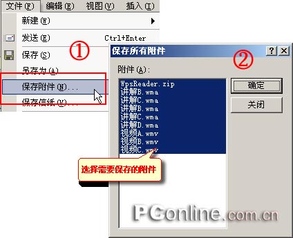 我们都知道在电子邮件的附件上右击鼠标选择“保存”可以将附件保存为本地磁盘的文件,但是如果附件有几十个,那还不得活活累死!不过没关系,我们可以选择邮件,然后打开菜单“文件->保存附件”,然后在弹出的对话框中按住Ctrl选择需要保存的附件文件就可以了,如图 7。