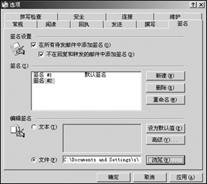 4、选择“工具/选项”,在“签名”选项卡中单击“新建”按钮(如图1),会在“签名”列表中出现“签名#1”,单击“设为默认值”按钮将其设为默认值,然后单击“高级”,在打开的“高级签名设置”对话框中选中要使用签名的账号前的复选框,在“编辑签名”项目栏中选择“文件”单选按钮,通过其后的“浏览”按钮,选择刚刚保存过的“1.htm”作为签名文件。