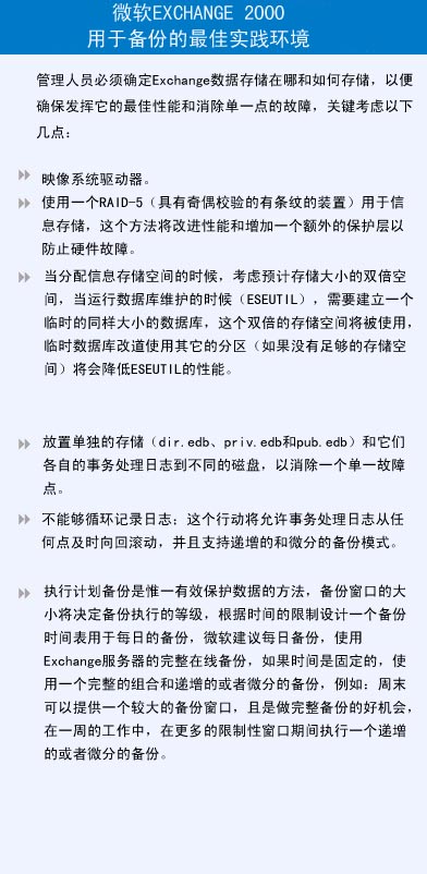 我们应该理解Microsoft Exchange 2000和Microsoft Windows® 2000 Active Directory® 之间的交互作用可以使的Exchange 2000环境下的维护和恢复变得非常容易。同样的,我们应该理解数据库文件,处理记录和补丁还有检查文件的作用是帮助管理员们从失败或从特定的时间点来恢复数据。