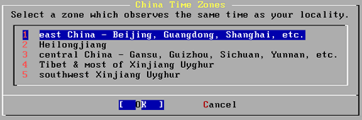 当然是选北京时间了,回车,接下来系统再次询问,是否属于该时区,选(Yes)