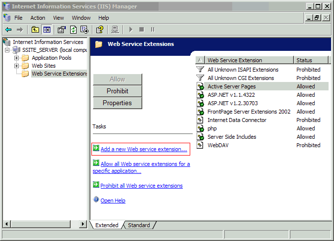 2. Start -> Run -> %SystemRoot%\system32\inetsrv\iis.msc (%SystemRoot%为操作系统所在目录,如: C:\Windows) 点击Service Extensions,在主窗口左侧的 Add a new Web service extension... 上点击添加新的服务扩展,如下图: