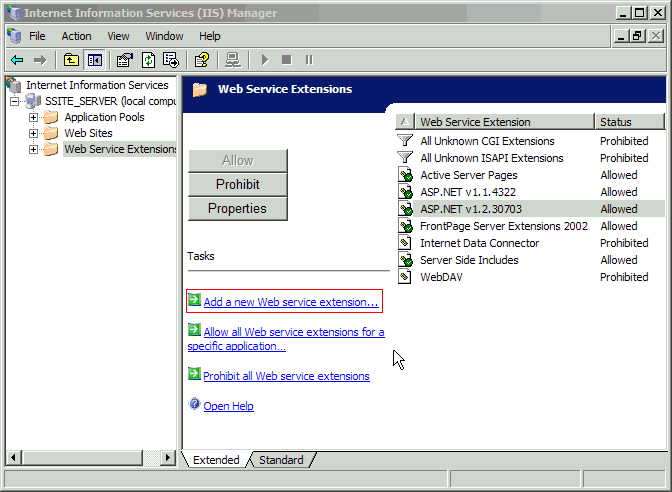 2. Start -> Run -> %SystemRoot%\system32\inetsrv\iis.msc (%SystemRoot%为操作系统所在目录,如: C:\Windows) - 点击Service Extensions, 在主窗口左侧的 Add a new Web service extension... 上点击添加新的服务扩展, 如下图: