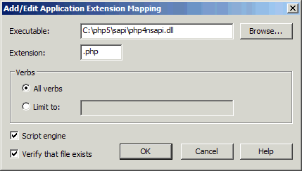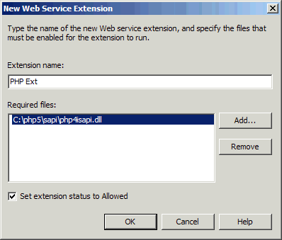 - New Web Service Extension 对话框中, 在 Extension Name 中输入自定义的标识, 如: PHP Ext, 在Required Files 中单击Add, 输入 c:\ php \ php.exe ,并确定下面的"Set status to allowed" 选项被选中;