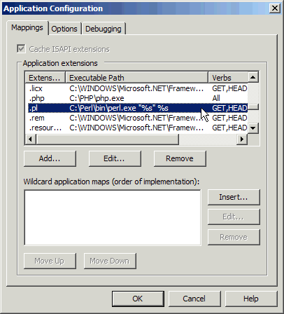 打开cgi-bin虚拟目录的properties,在 Application Configuration 确认 .pl 扩展已经被正确的映射: