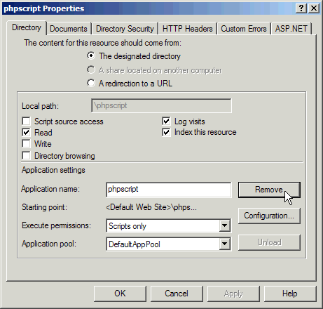 - 在Default Web Site 中打开 phpscript 目录的属性对话框,在 Application setting 中点击Create,生成 phpscript 应用程序(注意: 运行权限为 scripts only):