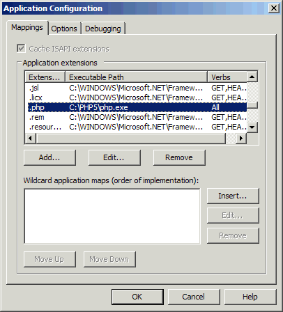 - 点击Configuration, 进入应用程序设置对话框, 检查在application extensions中是否有.php项目, 如有, 跳过这一步, 如没有添加一个extension mapping:
