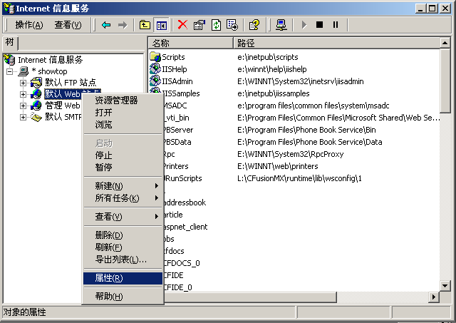 单击“默认 web 站点”,然后右键单击它,选择“属性”,打开对话框