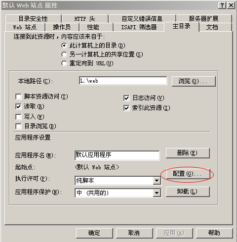 单击“主目录”,做如下设置:在“本地路径”中选择你的机子上要作为站点根目录的文件夹,比如我的是L:\WEB,如下图:然后点击右下方的“配置”,弹出新的对话框