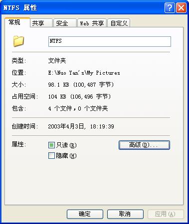 在NTFS文件(夹)权限中,拒绝永远优先于允许,由于NTFS权限是累积的,即如果一个用户同时在两个组中,并对于同一文件(夹),管理员同时对这两个组都赋予了不同的权限,那么这个用户将拥有这两个组的权限的并集,所以,如果这个用户属于的一个组有Read权限,而他属于的另一个组的READ权限处于“拒绝”状态,他是没有读取权利的。2.NTFS数据压缩特性