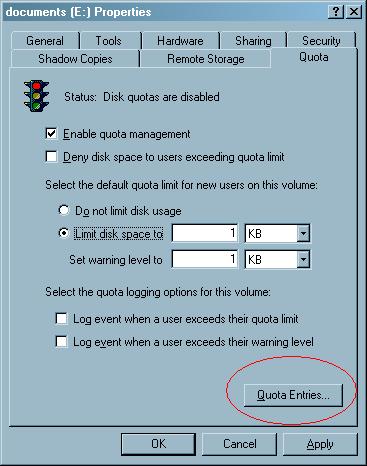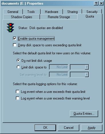 在Windows 2000/xp中,系统的NTFS5支持磁盘配额,来控制用户在服务器中的磁盘用量,当用户使用了一定的服务器磁盘空间以后,系统可以:1.发出警告; 2.禁止用户对服务器磁盘的使用; 3.将事件记录到系统日志中。这样,域中的用户便不可随意使用服务器磁盘空间、在服务器磁盘中存放过期的、杂乱的个人文件了。当然,磁盘配额在个人计算机中也可使用,并可使磁盘管理更加方便。要启用磁盘配额: