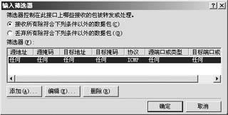 图1中有两个按钮,一个是“输入筛选器”(指对此服务器接受的数据包进行筛选),另一个是“输出筛选器”(指对此服务器发送的数据包进行筛选),这里应该点击[输入筛选器] 按钮,会弹出一个“添加筛选器”窗口,再点击[添加]按钮,表示要增加一个筛选条件。
