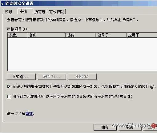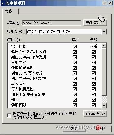 上面提到了,我们要对每个用户访问文件夹的操作进行跟踪并形成日志,要实现这个功能就要给abc文件夹添加审核。打开abc文件夹的属性,然后打开“安全”标签,点“高级”按钮,在“审核”标签里给这个文件夹设置审核,如图9。点“添加”按钮,在"选择用户和组"对话框里填入“wawa”组,如图10,确定后把完全控制的成功和失败都设置为审核项目,如图11。