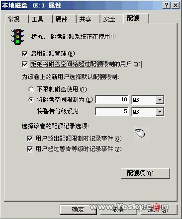 下面该为用户设置默认磁盘配额了,磁盘配额是NTFS5.0的新增的功能。再abc文件夹所在的磁盘属性里,找到配额标签。把“启用配额”和“拒绝将空间给超过配额的用户”前面的钩选上。将磁盘空间限制为10M,警告级别设置为5M,具体数值可根据用户的需要来分配。把下面的“用户超出配额限制时记录事件“和”用户超过警告登记时记录事件”。如图13。