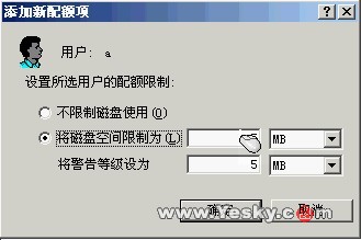 设置了默认的配额选项后就要为每个具体的用户设置配额选项了,点击“配额项”按钮,在打开的对话框里分别给a,b,c用户设置配额,点新建配额,然后选择用户,填写配额大小和警戒大小就可以了,如图14。