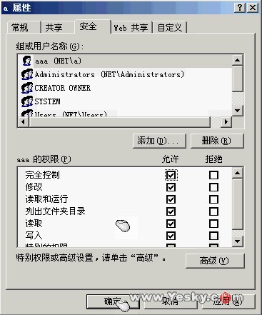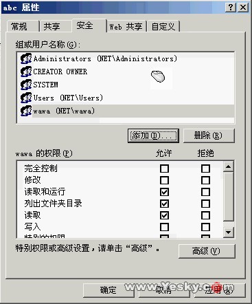 这里有个问题就是上次,我们设置过abc文件夹的权限,这次又在这里设定,这在Windows 2003里是允许的,但是它遵循3个原则:多个组赋予的许可是叠加的;文件许可优先于文件夹;拒绝访问许可优先。通过这个原则我们知道abc这个文件夹管理员可以完全访问,并且每个用户可以完全访问自己的文件夹,对其它用户的文件夹有只读权限,这正是我们所需要的结果。