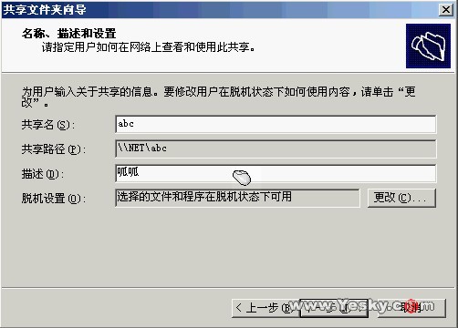 打开文件共享管理器,如图6。依次点“共享”-“新建共享”,启用“文件夹共享向导”,选择abc文件夹并把它共享,如图7。点下一步,输入共享名和共享描述,如图8。在脱机设置里可以根据需要设置共享文件夹的脱机选项,具体概念请查阅相关文档,这里不多做解释了,一般默认就可以了。下一步后,在权限设置里,设置为“管理员拥有完全访问权限,其它用户有只读访问权限”。