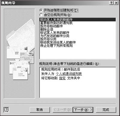 由于是精灵方式,所以可根据界面提示,对邮件名、发件方名称、处理内容进行逐项设定。 “Outlook”也具有垃圾邮件删除功能,相当于一个简易的“规则向导”操作过程。 除上述软件外,只要不是特别简易的软件,一般都有邮件分发功能,通过这项功能进行自动删除就可以了(如图1)。