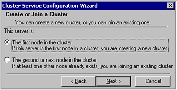 在安装的第一个阶段,必须提供所有的初始配置信息,以创建群集。这可以通过群集服务配置向导来完成。