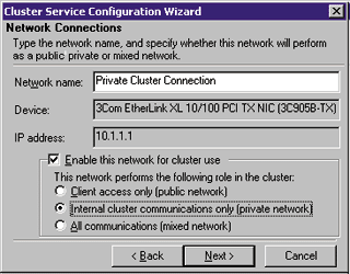 每个群集节点都至少需要两个网络适配器-一个连接公众网,一个连接内部网(它只包含了群集节点)。