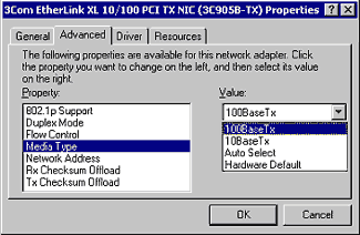 · 应该将内部网网络适配器的速度设置为网络的实际速度,而不是缺省选择的速度。从下拉列表中选择网络速度。不要使用速度的自动选择设置。一些适配器在确定网速时要掉包。为设定网络适配器的速度,单击适当的选项,如媒体类型或速度。