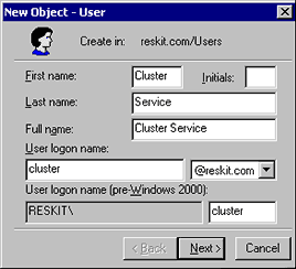 键入群集服务帐号的用户名,它是在安装前创建的。(在我们的例子里,该用户名是cluster。)不输入口令,键入域名,并单击下一步。