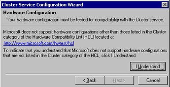 7. 将显示下面图7所示窗口。单击我理解,接受安装条件-所用硬件在硬件兼容列表中都可找到,它们都支持群集服务。