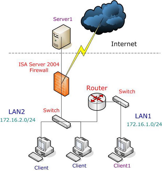 LAN1(172.16.1.0/24)和LAN2(172.16.2.0/24)两个子网通过Router相连,位于172.16.1.0/24子网的Client1想通过连接到172.16.2.0/24子网的ISA Server防火墙访问外部网络,Server1是Internet上的一台FTP服务器。